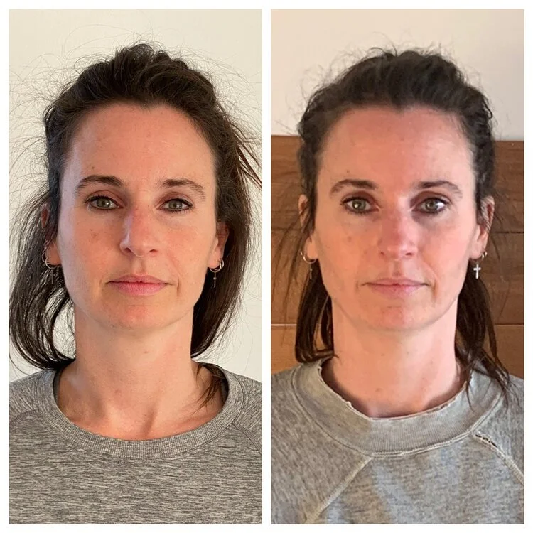 Notice in both photos, how much stress constricts and pinches the face. Our faces hold a lot of stress, once it’s released, the face relaxes and expands. Nature’s very own non surgical facelift